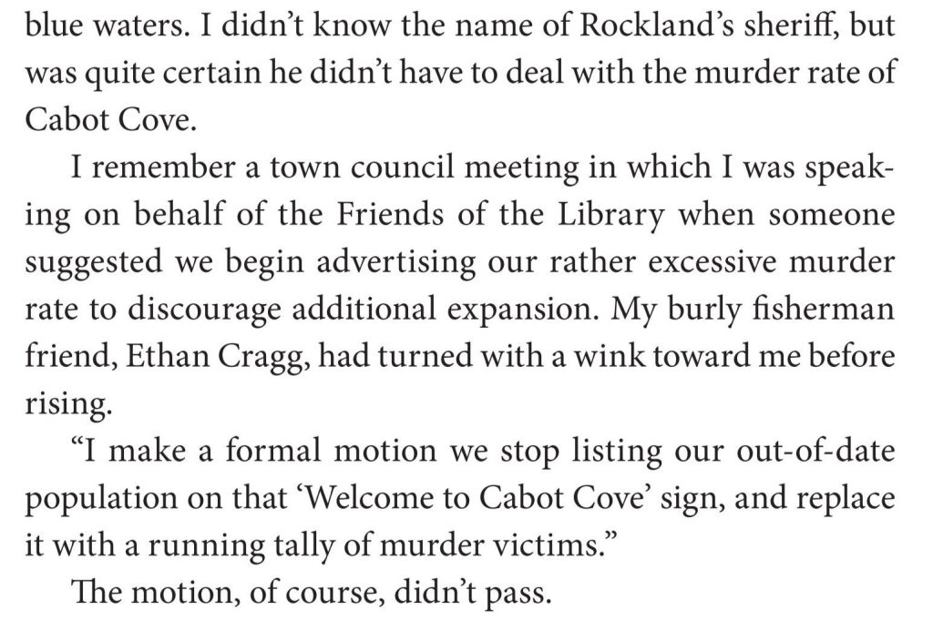 Murder in Red weaves in characters from the series (even more minor ones such as Jean O’Neill who appeared in four episodes of the show as the town librarian), and gives a nod and a wink to long-standing jokes about the series (such as Cabot Cove’s dwindling population). I highly recommend it for Murder, She Wrote fans.