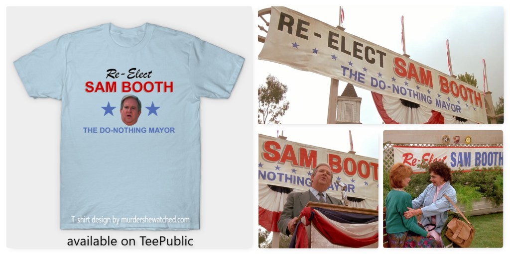 If you’re a fan of the Cabot Cove episodes featuring Mayor Sam Booth, you may be interested in one of the products with my “Sam Booth for Mayor” design. This design is directly inspired by the election signs seen in the episode “Town Father”. Available on TeePublic: