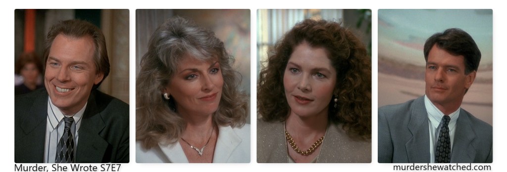 One interesting thing about this episode is that it somewhat confirms a theory I have about the series timeline. At one point in the episode, it’s mentioned that “seven years ago”, shortly before Preston Giles went to jail, he had suspected that Martin Bergman was stealing from the company but he never had a chance to confront him. Since this episode aired in November 1990, seven years prior to that would have been November 1983—almost one year before Murder, She Wrote first aired in September 1984. This suggests that the events depicted in the pilot episode “The Murder of Sherlock Holmes” may have happened almost one year before the events in the first regular episode of the series. This would explain how Jessica Fletcher went from publishing her first novel in the pilot episode, to having already had a second novel published and working on her third early on in the first season.