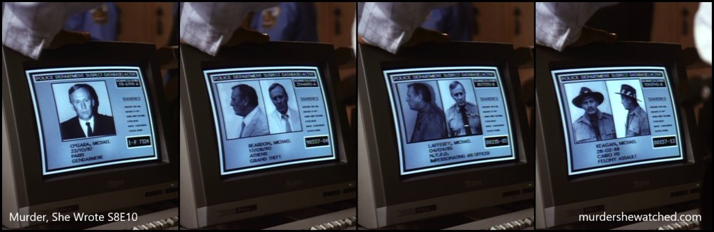 Finally, it was interesting to note all the references to Michael Hagarty’s previous appearances on the show. For instance, Jessica at one point tells him “If you think this is going to be another San Francisco or Athens”, in reference to their adventures in “J.B.. As In Jailbird” and “Appointment in Athens“. We also get to see Michael’s many secret identities that make up his police record.