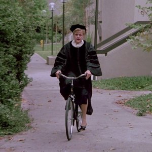 In this episode, Jessica Fletcher is at the fictional Crenshaw College in order to give a commencement speech and receive an honorary degree. The mystery in this episode involves several faculty members. The episode is memorable for its scene of Jessica Fletcher wearing academic regalia while riding a bicycle.