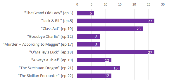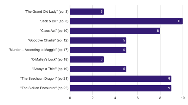 As you can see in the above chart, the one episode that got the most votes was “Jack & Bill” (with 10 votes)—viewers would have loved to see more stories of the private detective and his sidekick poodle! The Cabot Cove episode “The Szechuan Dragon” and Michael Hagarty episode “The Sicilian Encounter” were close seconds with 9 votes each. And a close third was “Class Act”—the story about a cop-turned-college instructor and his students.