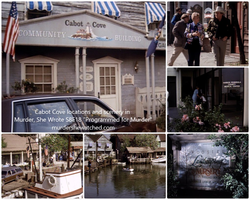 There’s not much more of note about this episode except that, as a Cabot Cove episode, we get a glimpse of some Cabot Cove locations. Specifically, I liked the nice sign above the “Cabot Cove Community Centre” (located on the Universal Studios Lot). Additionally, I found it interesting to see the sign on the medical center read “Harbor Peninsula County” and was disappointed to learn that there is no such county in Maine, as I was hoping that this would provide a clue regarding where in Maine the town is meant to be located.
