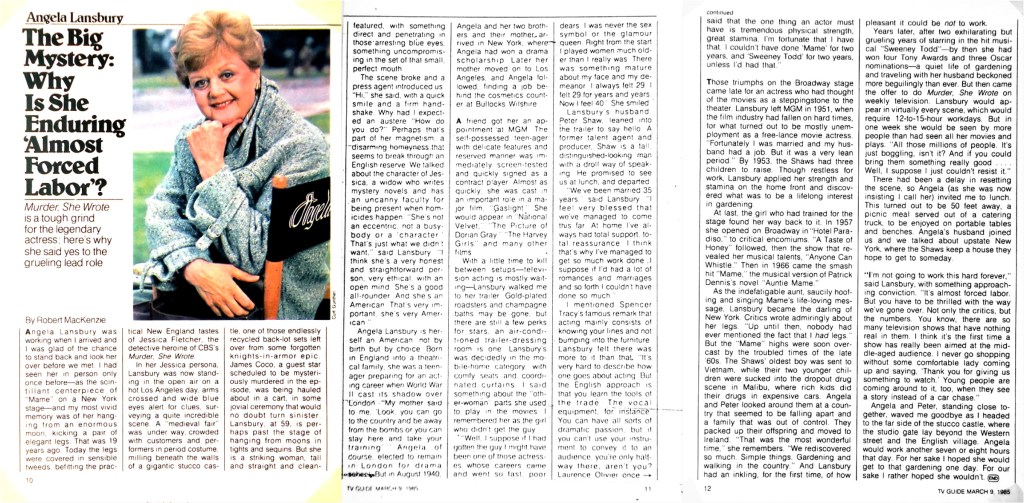 Unfortunately, many of the scans were a bit hard to read, and so I thought it would be nice for fans of the show to be able to read a transcript of those articles. Below, I have included the original scanned pages to the very first TV Guide cover story about Murder, She Wrote-–which appeared in the March 9th, 1985 issue—and have retyped the entire article below. I do not own the copyright to the article, and I hope the original author can forgive my sharing it with fans on this website.