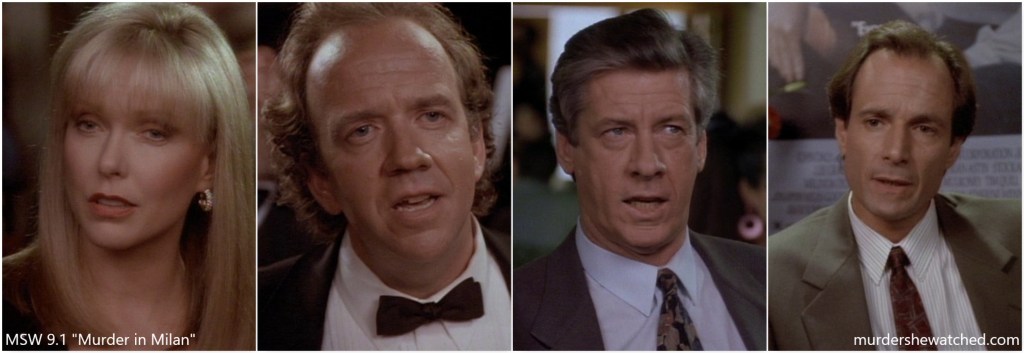 • Susan Blakely plays Catherine Wayne, the owner of Catherine Wayne Productions which produced All the Murderers. This is Blakely’s third of four appearances on MSW; she previously appeared in “The Error of Her Ways” and “Suspicion of Murder“.