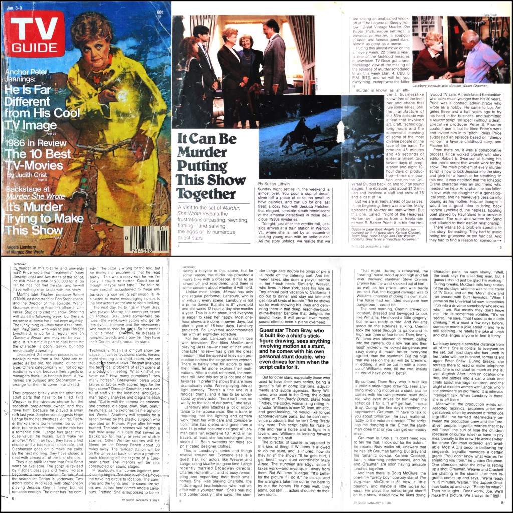 This particular article is a deep look at the production of a specific episode of Murder, She Wrote. Namely, it looks at the 11th episode of season 3, “Night of the Headless Horseman”, which aired for the first time that week (on January 4th 1987). Interestingly, as the article notes, the episode was initially meant to be a sequel and feature the character of Horace Lynchfield from the season 1 episode “Footnote to Murder” (S1Ep19). However, the guest starring character was rewritten when Paul Sand, the actor who played Horace Lynchfield, could not be brought back to appear in the episode. In addition to this little bit of trivia, the article goes into a lot of interesting details regarding the set dynamic involving the cast and crew.