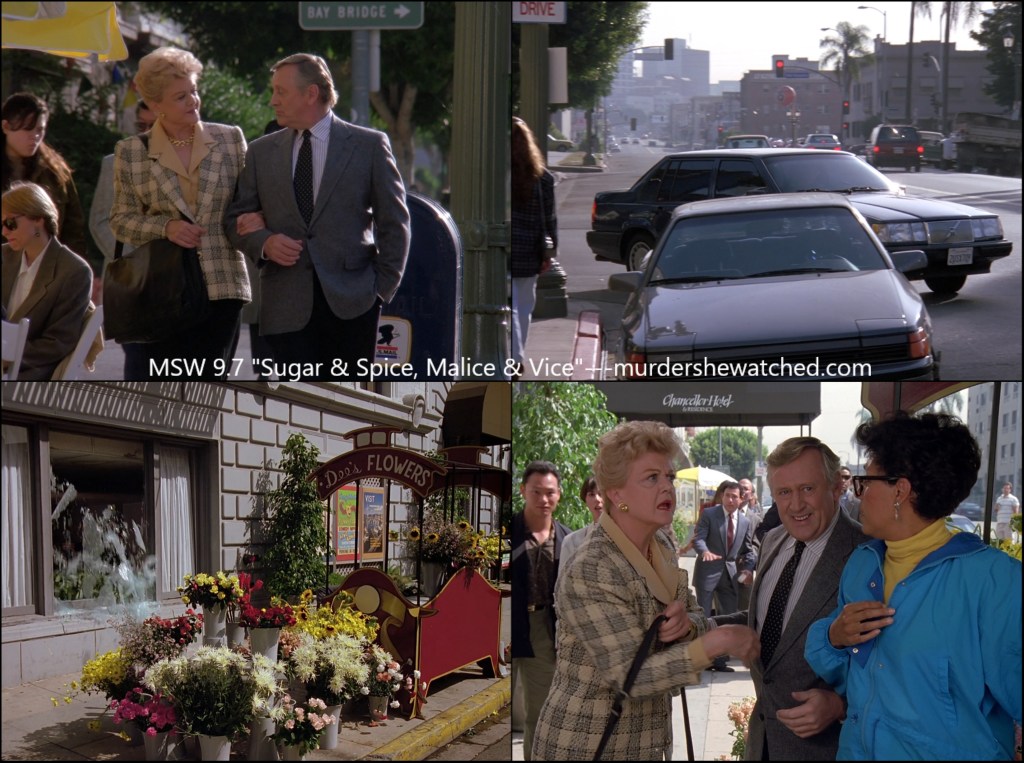 One thing that I obsessed over while watching this episode is trying to figure out the filming locations. I noticed at one point Jessica and Michael walking with a street sign indicating the way to “Golden Gate Bridge” and “Bay Bridge” behind them. This got me a bit excited because Angela Lansbury didn’t go out of her way to shoot on location — at least not in the later seasons — so could it be that this was actually filmed in San Francisco? Well, after gathering clues from other building and street signs visible in the background, it turns out my excitement was unfounded. The street that Angela Lansbury and Len Cariou are actually walking down is W 7th Street in Los Angeles, between New Hampshire Ave. and S Catalina St.
