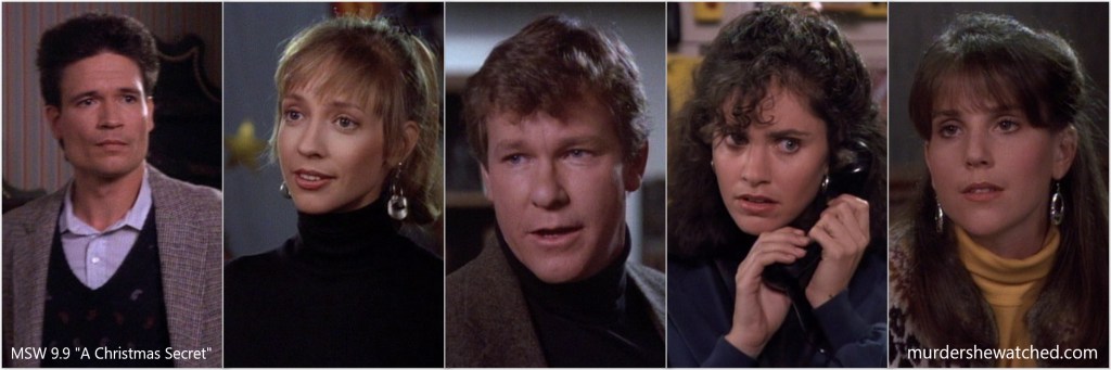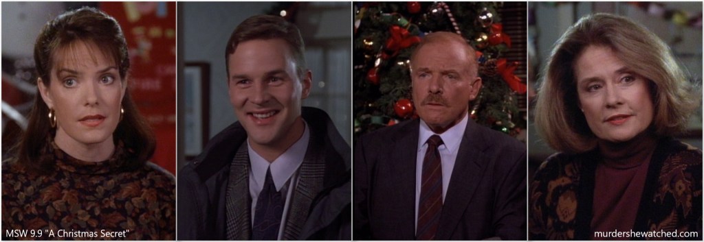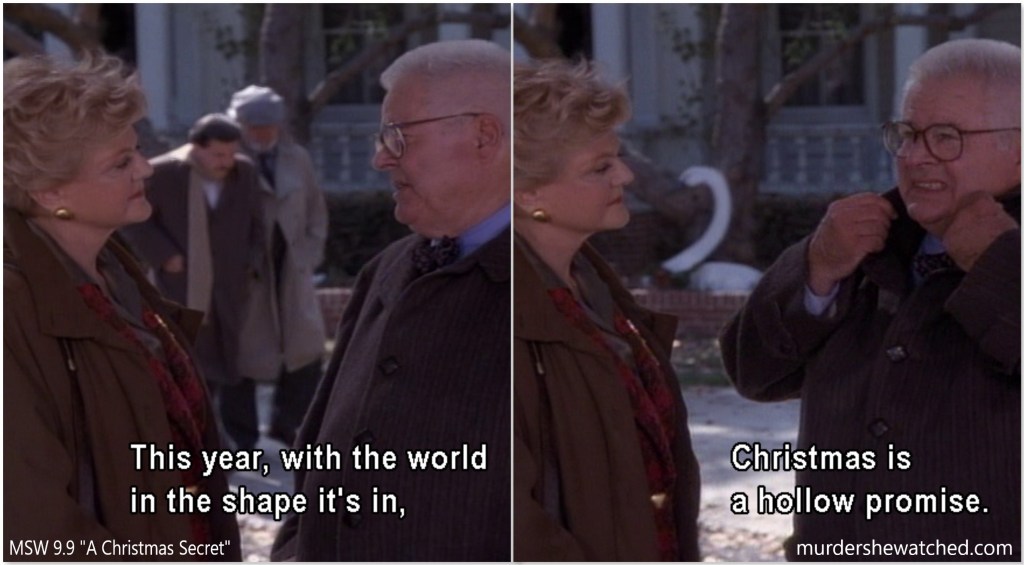 As usual with many Cabot Cove episodes, we learn a bit more about the regular cast and characters in this episode. For instance, we learn that Mort is the leader of the Cabot Cove Caroleers as well as the Pistol Club. We learn that Adele takes time away from Christmas festivities to deliver food to a nearby town. And we also learn that Seth didn’t get a coveted train set for Christmas when he was 10 years old.