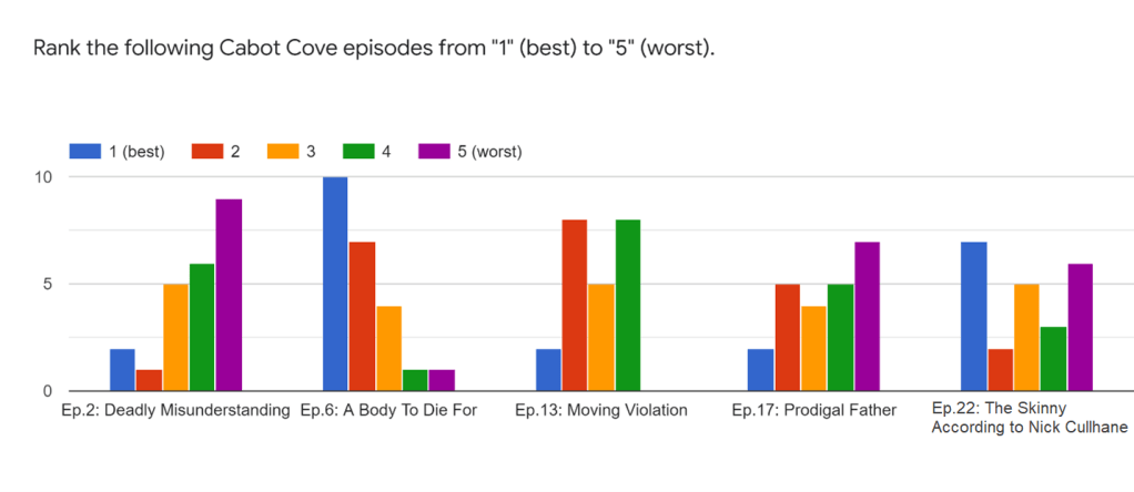 Since this post was first published, there were 23 Murder, She Wrote fans that took part in the survey. They were asked to rank the five Season 7 episodes/stories set in Cabot Cove from 1 (best) to 5 (worst). According to their votes, the following ranking emerged: