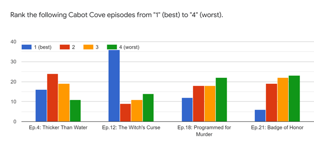 Notably, although approximately the same number of people ranked “Badge of Honor” and “Programmed for Murder” as “worst” (with 23 vs 22 votes, respectively), there were significantly fewer people who liked “Badge of Honor” best. That episode only received 6 votes for “best” compared for 12 votes for “best” given to “Programmed for Murder“.