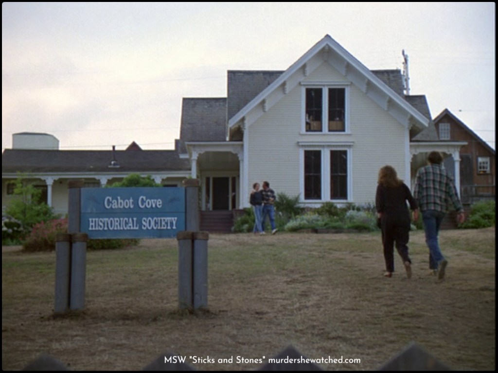 The previous scene is briefly interrupted by Jessica pointing out the Cabot Cove Historical Society building to her guest.