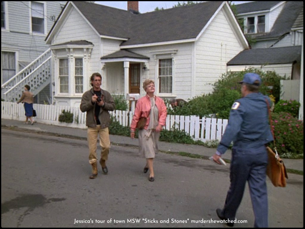 Shortly thereafter, we see Jessica giving her house guest (played by Parker Stevenson) a tour of Cabot Cove. They are first seen walking through the town and passing by the mailman — who delivers some poison pen letters to the inhabitants of the nearby houses.