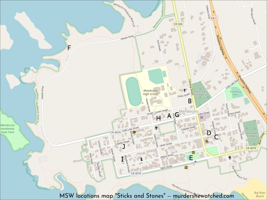 Locations are marked using letters on the map. They correspond as follows: (A) Jessica’s house; (B) Beverly Gareth’s house; (C) Jessica cycling and meeting Amos Tupper; (D) Jessica showing her guest the town; (E) the Cabot Cove historical society; (F) the site of the old Cabot Cove lighthouse; (G) Amos Tupper’s house; (H) Elvira Tree’s house/Gallerie Frederich; (I) the Cabot Cove library; and (J) Edna’s house.