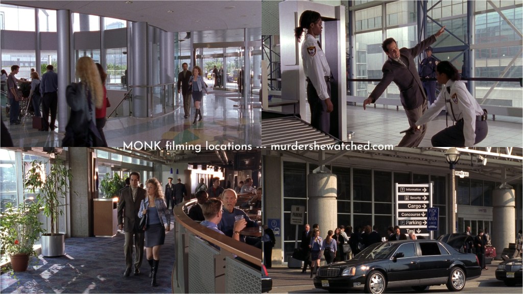 Although the final episode of the season predominantly takes place either indoors or on a set made to look like the inside of an airplane, there are nonetheless a few scenes filmed inside public buildings in Toronto. The opening scenes in which Monk accompanies Sharona to the airport in San Francisco (as seen in the top two images in the collage below) were all filmed in the Metro Toronto Convention Centre. In the top left image in the collage below, you can even pick out a unique frog design on the terrazzo flooring.
