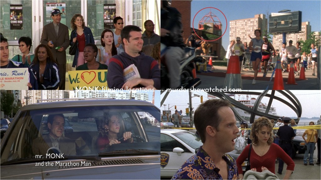 Some might be quite surprised to find out that many of these scenes were filmed practically at the foot of the CN Tower — Toronto’s most famous landmark. For instance, the top left image in the collage below show Monk and Sharona watching the marathon from the northwest entrance to the parking lot at Roundhouse Park — this is near near 255 Bremner Boulevard and just across the street from the CN Tower. The top right image shows the marathon approaching their location. If you look closely, you can see a tower with the old Metropolitan Toronto logo on it (circled in red). The weird giant suitcase-looking thing in the same picture is actually the film crew’s way of obscuring a giant sign for the Rogers Centre (formerly known as the SkyDome).