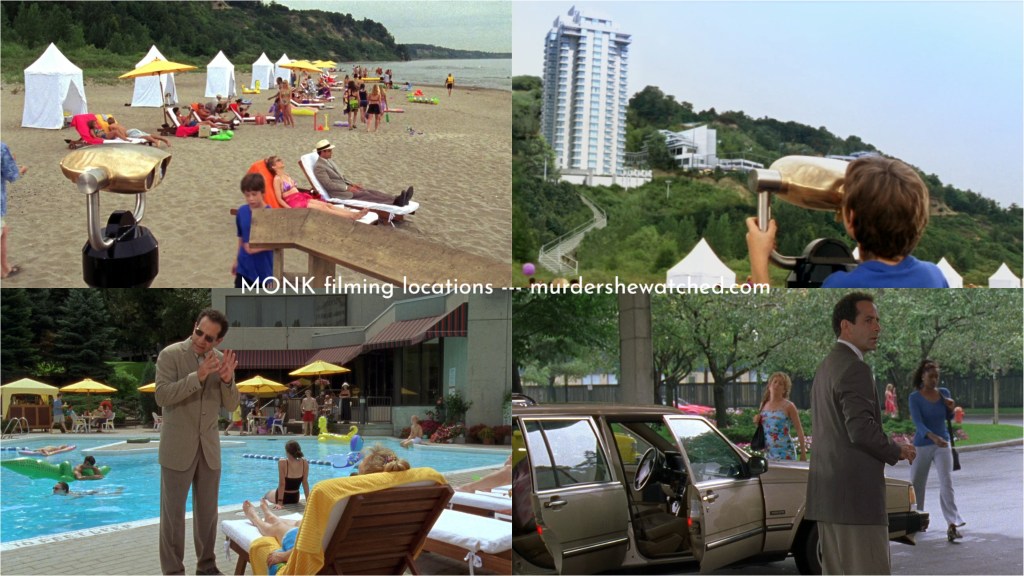 In reality, this scene was filmed at Bluffers Park Beach — on the opposite end of the Scarborough Bluffs that appeared in the episode “Mr. Monk and the Psychic” — and the image of the hotel looming on the cliffs above was digitally inserted.