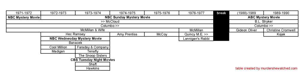 The chart in the image below provides an at-a-glance summary of the series that ran between 1971 until 1990. Note: Arrows indicate whether a show is a continuation of a show that premiered in the preceding season (as was the case with McCloud initially starting as part of Four in One), or whether a show continued into the following season beyond the end of the wheel series (as was the case with Columbo and Quincy, M.E.).